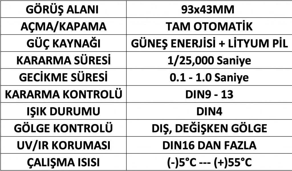 Görüş Alanı: 93x43 mmAçma/Kapama: Tam OtomatikGüç Kaynağı: Güneş Enerjisi + Lityum PilKararma Süresi: 1/25,000 SaniyeGecikme Süresi: 0.1-1.0 SaniyeKararma Kontrolü: DIN9-13Gölge Kontrolü: Dış, Değişken GölgeUV/IR Koruması: DIN16’dan FazlaÇalışma Isısı: (-) 5°C--- (+) 55°CTaşlama işlemleri, plazma kesme uygulamaları, oksiasetilenkaynağı ve lazer kaynağı dışında kalan bütün kaynakyöntemlerinde kullanılabilir.TIG ve gazaltı kaynağı uygulamalarında kaynakçıya rahat vesağlıklı çalışma olanağı sağlar.- Yüzü tam örter, öne ve arkaya ayarlanabilir. Bu sayedekaynakçının çalışırken kendisini daha rahat hissetmesine olanaksağlar.- Kararmaya karşı hassasiyeti ayarlanabilir (düşük veya yüksek).- Karanlıktan aydınlığa geçiş süresi ayarlanabilir.- Polikarbonat ve yüksek darbe dayanımlı plastikten üretilmiştir.- CE ve ANSI standartları ile uyumludur.MIG - TIG - MMA İÇİN UYGUNDURFiltre ile Birlikte Satılmaktadır.